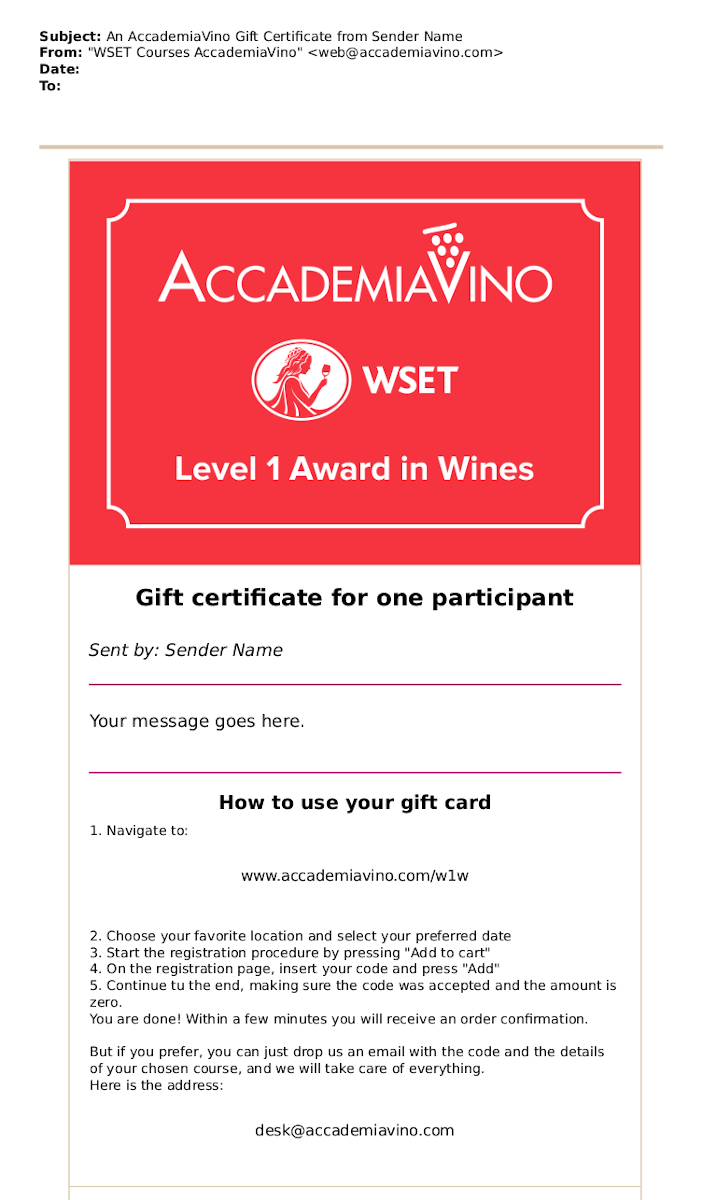 The WSET Level 1 Award in Wines is an easy, fun but highly informative programme. The course is usually delivered in one full day, with several options available for days of the week. Recipients of a Gift Card has full freedom to choose the date and AccademiaVino location that best suits their needs. In fact, if they wish, they are also free to switch from Level 1 in Wines to Level 1 in Spirits or Sake at no extra charge!